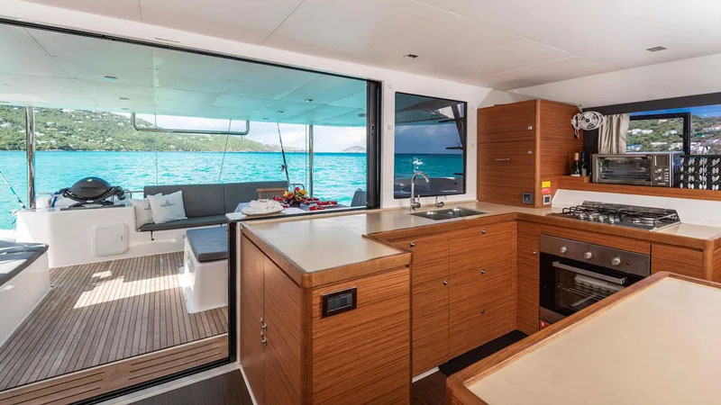 In true Bali catamaran style, the salon's aft wall lifts out of the way combining the bright and airy salon with the aft deck area. The salon's side windows slide forward to open up the entire space for an alfresco dining experience and panoramic views.